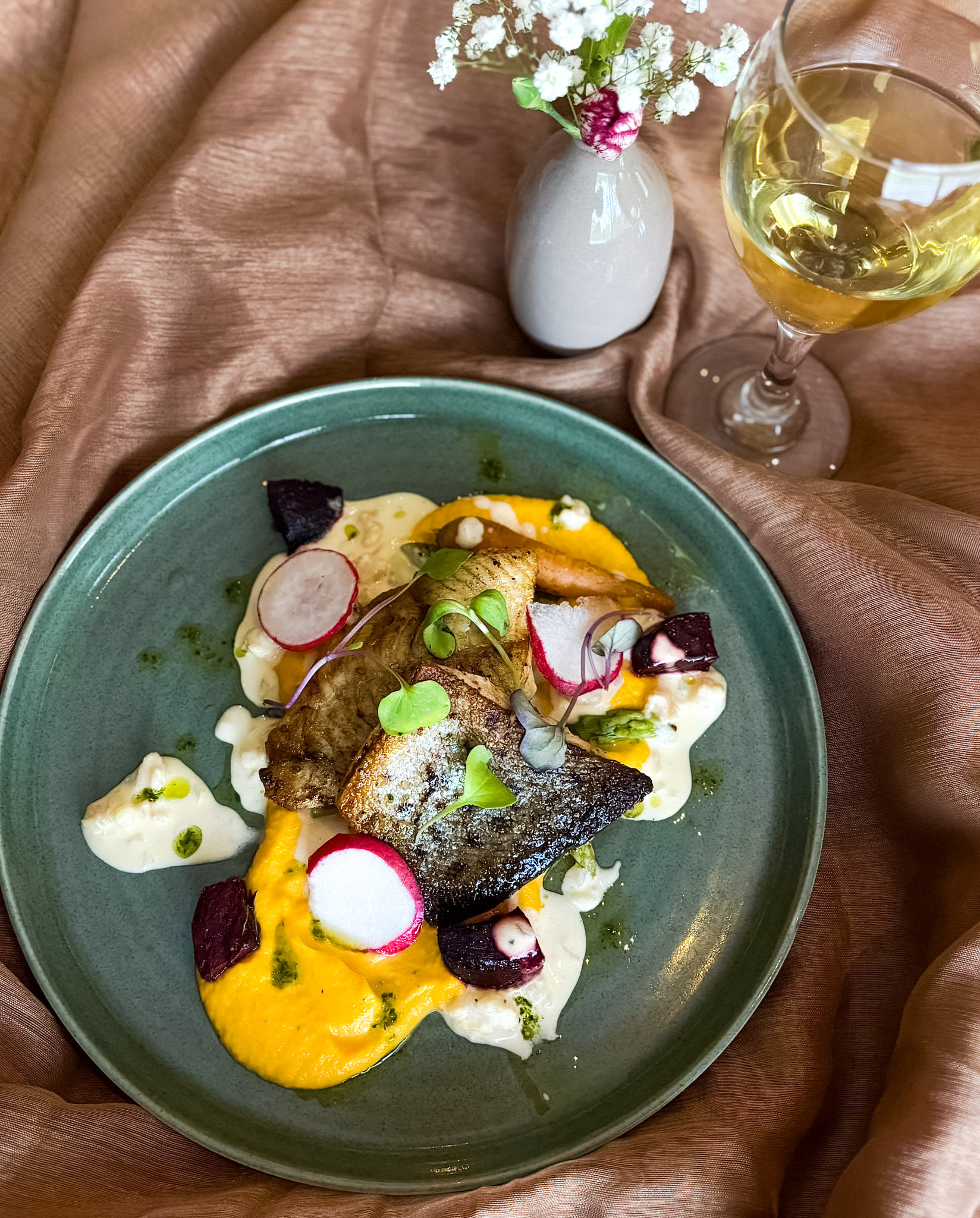 Pan-fried trout and pike-perch, carrot-sweet potato purée, crayfish sauce and roasted seasonal vegetables